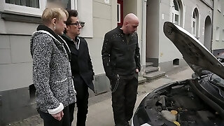 Titless worker Conny Dachs gets fucked by two lewd men