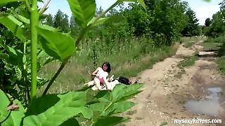 Highly erotic brunette teen getting bare and masturbating outdoors