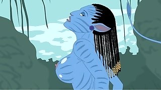 Busty 3D animated dark haired rides a blue monster's huge cock