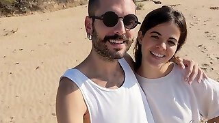Beach bunny showcases her tits then finishes off all over his cock