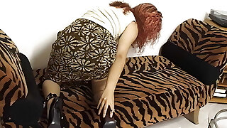 Busty furry girl with amazing big ass fingering her tight wooly pussy and sucking fingers in stockings