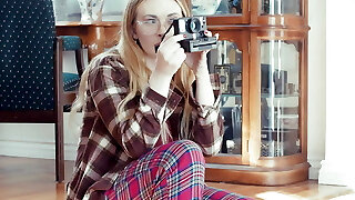 Light-haired with glasses plays with her pussy