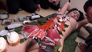 Kinky Japanese chick Haruka lets boys eat sushi off her body