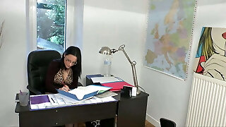 Busty brunette professor on the desk