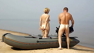 Wild beach. Sexy Milf Silver naked sunbathing on river bank, random fisherman guy sees. Naked in public. Nude beach