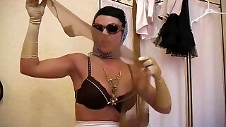 Angelica with natural tits wearing nylon stockings frigging herself